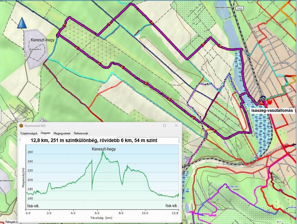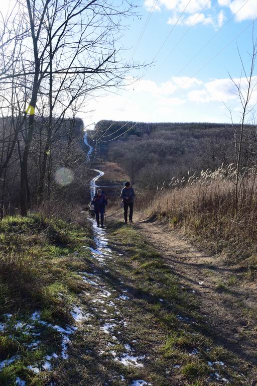 Az a 14 fő, aki a hosszabb túrát választotta, gyenge emelkedővel feljutott a Kereszt-hegy oldalába. Itt irányt válta elkezdtünk visszafelé menni, mégpedig háromféle úton. Páran a Pest Megyei Piros jelzésre felérve a (néhai) P+ jelzésen az Állami telepek vasútállomás felé indultak. Négyen az Ürgemajoron át értek fel a PMP-re, és onnan az isaszegi vasútállomásra. Csak hatan maradtunk, akik az eredeti úton, Ilkamajoron át értek a vasútállomásra (12,8 km, 251 m szint).